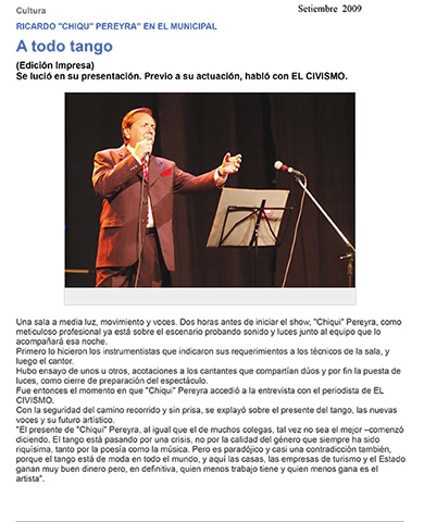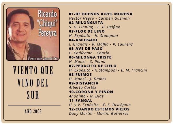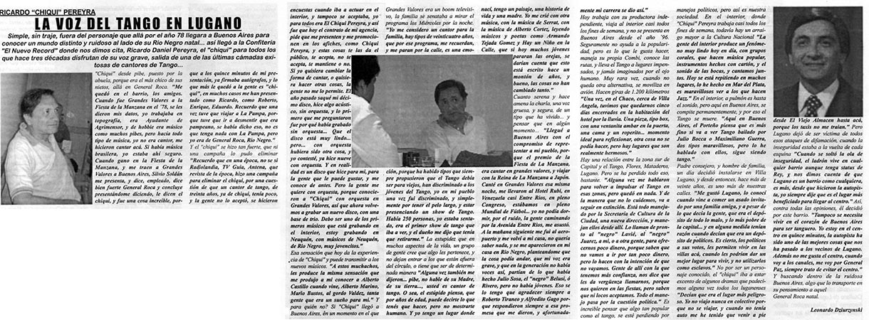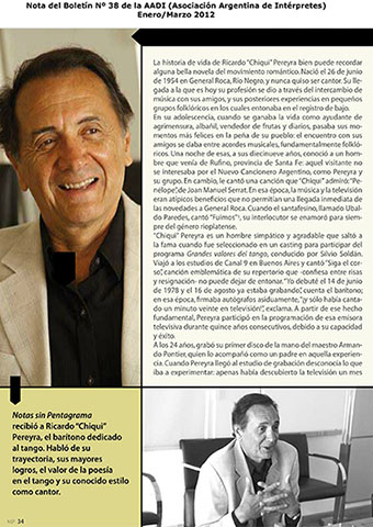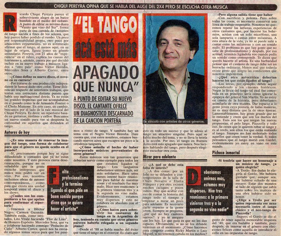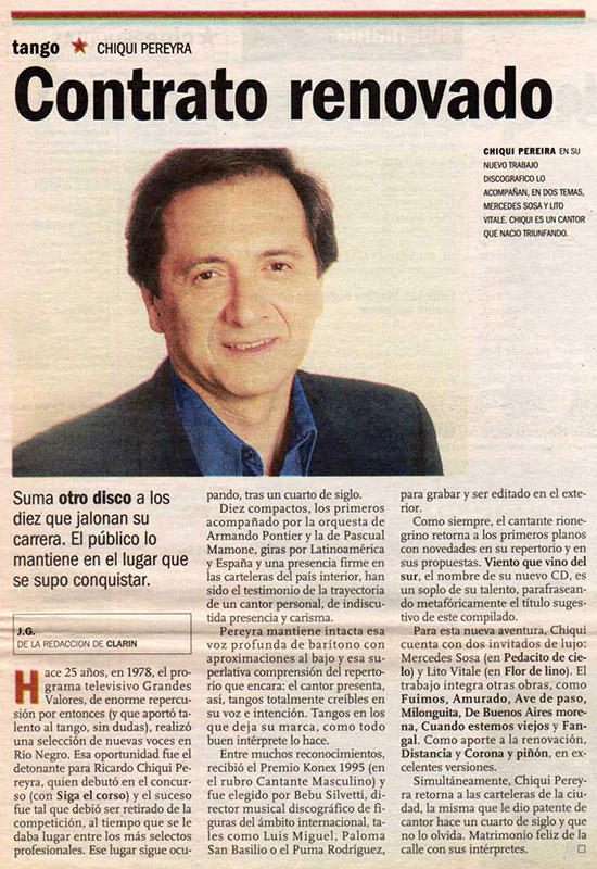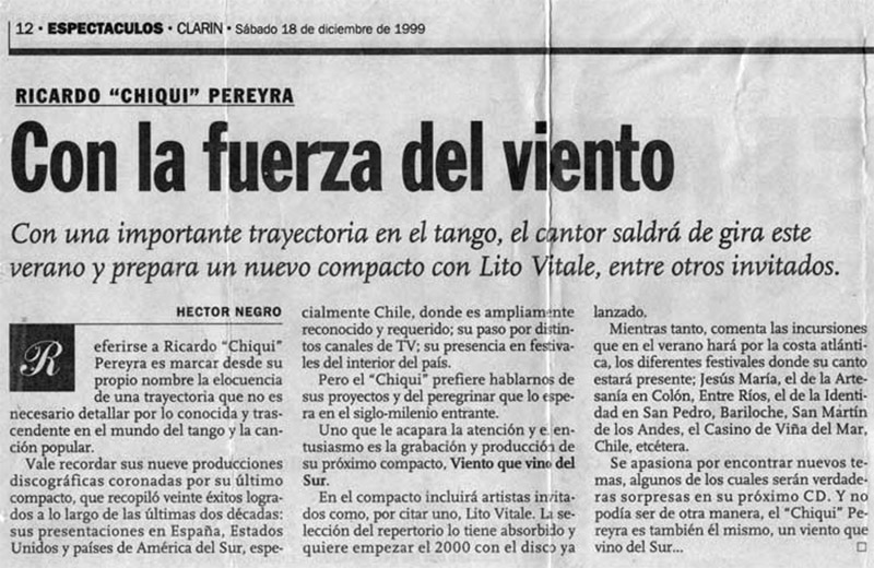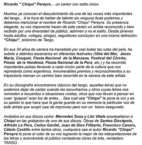 Ricardo "Chiqui" Pereyra nació el 26 de junio de 1951 en General Roca (Pcia. de Río Negro). Comenzó su carrera artística como cantante de folklore, formando conjuntos vocales en su ciudad natal. En 1978 en su ciudad se realizó una selección de nuevas voces y esa oportunidad se convirtió en el pasaporte para presentarse ante las cámaras de televisión. Llegó a Buenos Aires a los veintisiete años de edad, como concursante del programa "Grandes Valores del Tango". La repercusión fue tal que los directivos del canal decidieron retirarlo de la competencia y otorgarle el rango de profesional, integrando el elenco del programa donde permaneció cantando hasta 1992. como así también integrando el programa "Botica de Tango" hasta 1988. Paralelamente comenzó con giras al interior y al extranjero, presentándose en los más importantes escenarios. En 1996 fue elegido por Bebu Silvetti (director y arreglador musical discográfico de figuras internacionales como Luis Miguel, Plácido Domingo, Paloma San Basilio y el Puma Rodríguez) para grabar un CD que fue editado en el mismo año. Simultáneamente se incorporó al programa televisivo "La noche con Amigos" en Canal 7 donde estuvo hasta 1999. Filmó 2 películas y participó como invitado en otros programas.televisivos. Grabó 12 discos acompañado por importantes maestros: Armando Pontier, Pascual Mamone, Eduardo Corti, Omar Valente, entre otros. Su último trabajo, "Viento que vino del Sur" cuenta con la participación de Mercedes Sosa y Lito Vitale. En el año 2007 recibe el Premio SANTOS VEGA al mejor interprete masculino de tango. En abril del 2010 Sony Music reeditó sus éxitos en el CD "Una Vida de Tangos". Realizó diversas giras por las provincias de la Argentina y otros países, como España, Estados Unidos y, especialmente, Chile.