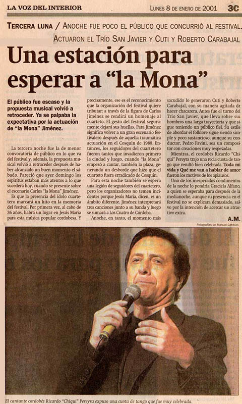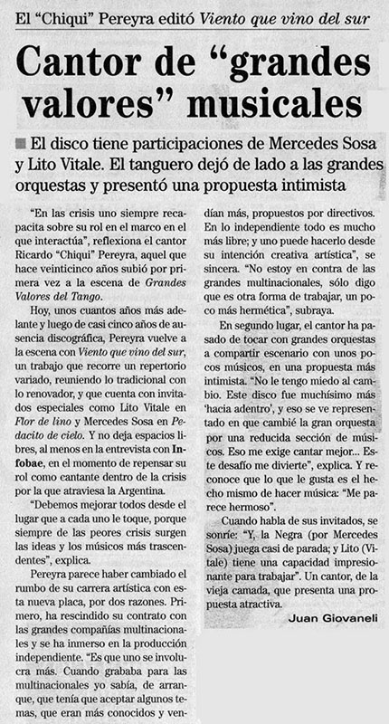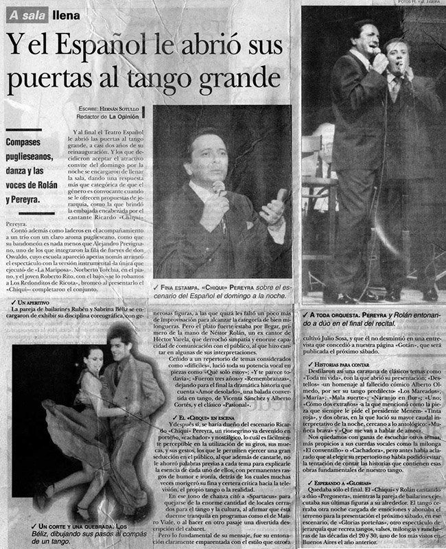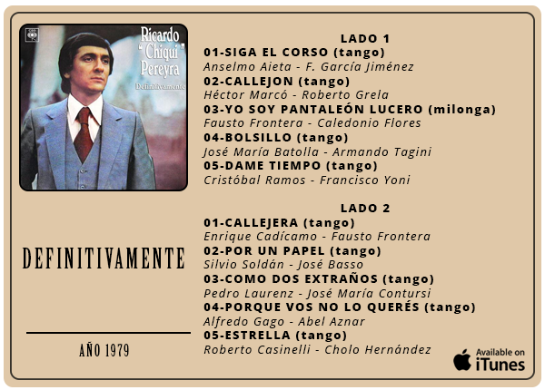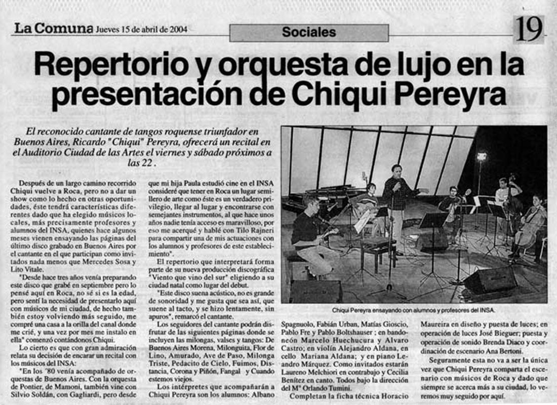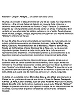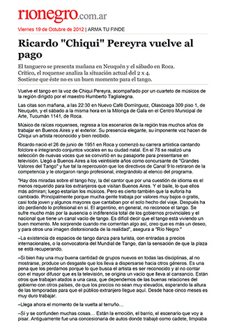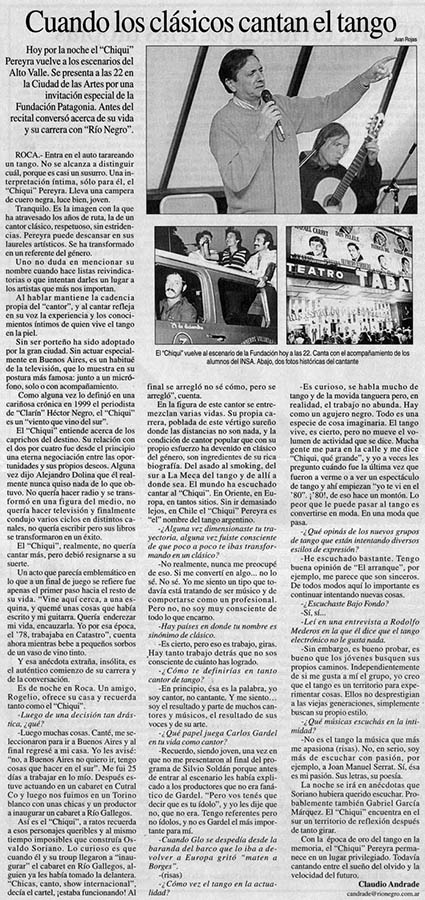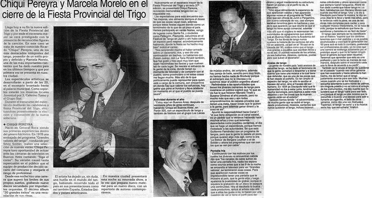 Ricardo "Chiqui" Pereyra nació el 26 de junio de 1951 en General Roca (Pcia. de Río Negro). Comenzó su carrera artística como cantante de folklore, formando conjuntos vocales en su ciudad natal. En 1978 en su ciudad se realizó una selección de nuevas voces y esa oportunidad se convirtió en el pasaporte para presentarse ante las cámaras de televisión. Llegó a Buenos Aires a los veintisiete años de edad, como concursante del programa "Grandes Valores del Tango". La repercusión fue tal que los directivos del canal decidieron retirarlo de la competencia y otorgarle el rango de profesional, integrando el elenco del programa donde permaneció cantando hasta 1992. como así también integrando el programa "Botica de Tango" hasta 1988. Paralelamente comenzó con giras al interior y al extranjero, presentándose en los más importantes escenarios. En 1996 fue elegido por Bebu Silvetti (director y arreglador musical discográfico de figuras internacionales como Luis Miguel, Plácido Domingo, Paloma San Basilio y el Puma Rodríguez) para grabar un CD que fue editado en el mismo año. Simultáneamente se incorporó al programa televisivo "La noche con Amigos" en Canal 7 donde estuvo hasta 1999. Filmó 2 películas y participó como invitado en otros programas.televisivos. Grabó 12 discos acompañado por importantes maestros: Armando Pontier, Pascual Mamone, Eduardo Corti, Omar Valente, entre otros. Su último trabajo, "Viento que vino del Sur" cuenta con la participación de Mercedes Sosa y Lito Vitale. En el año 2007 recibe el Premio SANTOS VEGA al mejor interprete masculino de tango. En abril del 2010 Sony Music reeditó sus éxitos en el CD "Una Vida de Tangos". Realizó diversas giras por las provincias de la Argentina y otros países, como España, Estados Unidos y, especialmente, Chile.